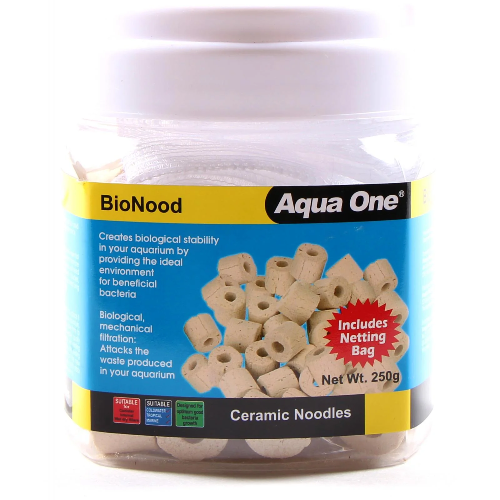 Aqua One BioNood is a cylindrical ceramic biological media that can be used in all types of filtration systems such as pressurised canister filters, hang on filters, internal filters and wet/dry filters. It acts as both a mechanical and biological filter media.